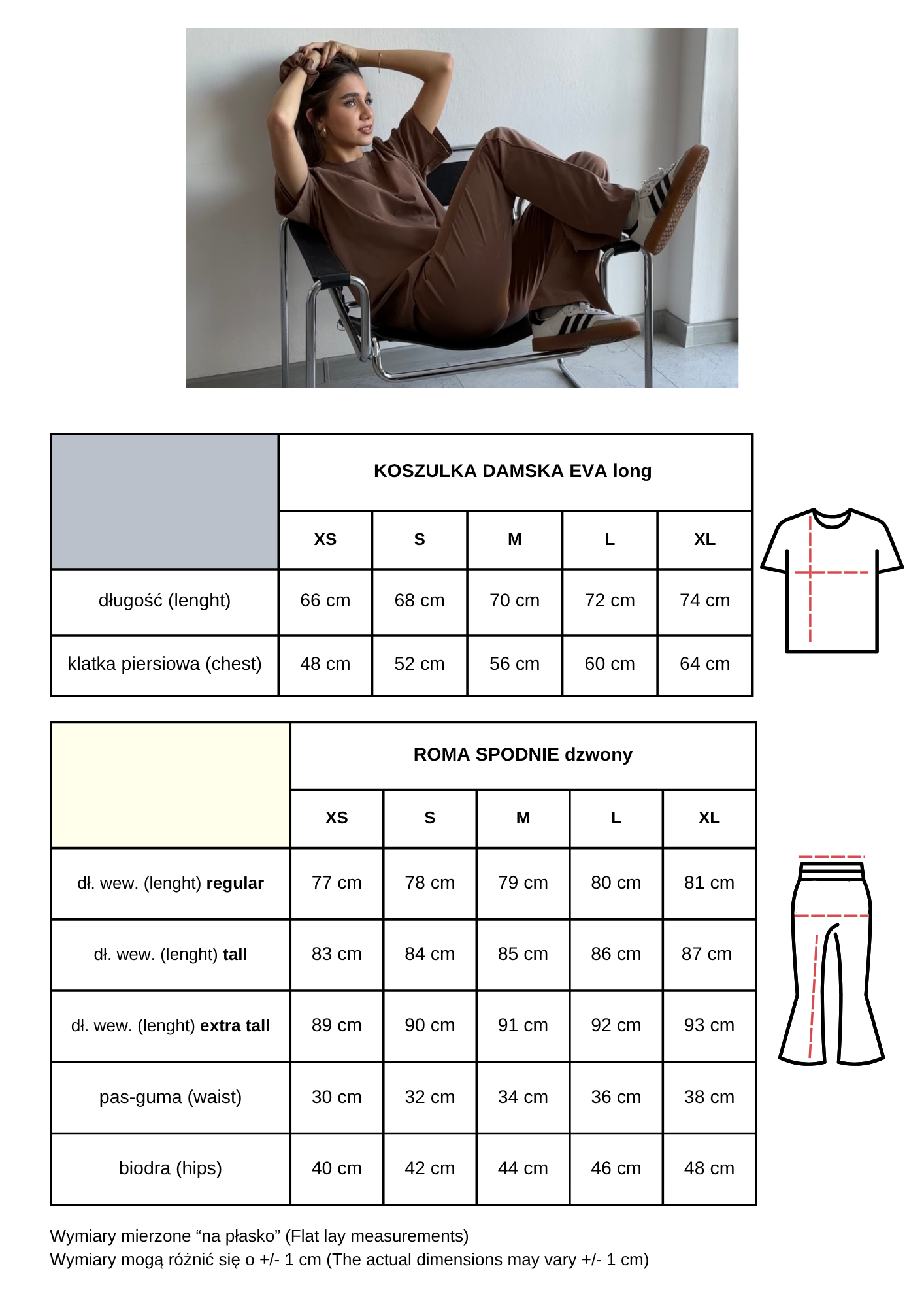 Modelka ma na sobie wydłużone spodnie S i koszulkę M.
